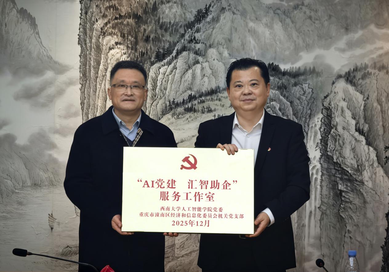 在充分沟通并达成共识的基础上,潼南区经济信息委与人工智能学院举行了“AI党建 汇智助企”服务工作室授牌仪式,标志着双方在党建引领下推进科技服务企业迈出了实质性步伐。夏俊表示,学院将以工作站建设为契机,进一步深化“AI+党建”融合模式,围绕企业技术难题组织攻关团队,解决企业实际问题,助力区域产业智能化升级。段书凯表示,将统筹考虑农业、工业、信息化等领域企业技术难题,组织学院优势科研力量开展定向技术研发与成果转化,为潼南区企业提供从技术咨询、方案设计到产品测试的全链条智力支持,助力企业突破关键技术瓶颈,提升核心竞争力。