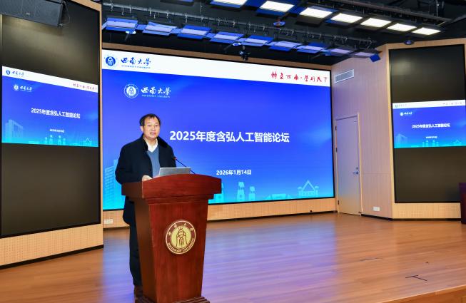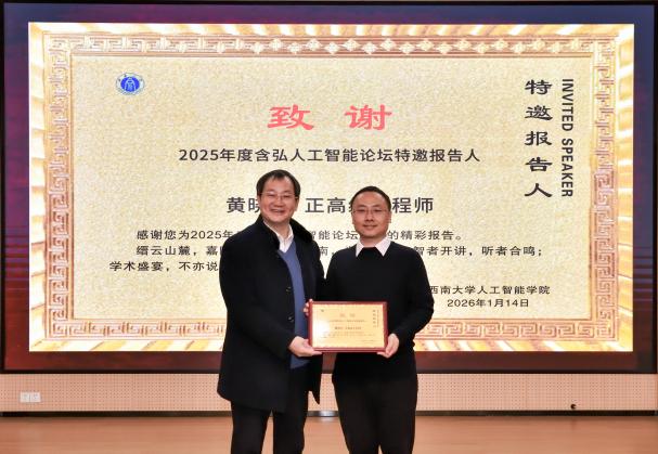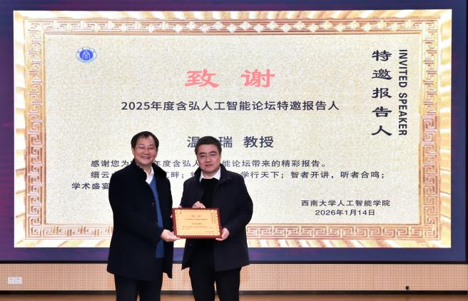 2026年1月14日上午,由西南大学人工智能学院主办的2025年度含弘人工智能论坛在西南大学出版社大楼305会议室成功召开。会议特邀了西安交通大学国际教育学院院长、国家级人才温广瑞教授,中国电科芯片技术研究院IC设计部副部长、国家级人才黄晓宗正高级工程师,浙江大学控制科学与工程学院百人计划研究员、浙江省杰青郭秀珍研究员,天津大学人工智能学院教授、天津市高层次青年人才于强教授作特邀报告。