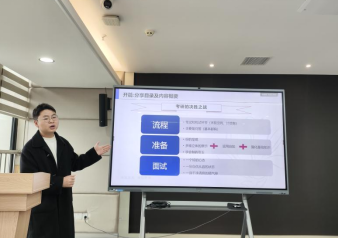 活动伊始,2023级硕士研究生吴付军同学作经验交流,他结合自身经历,围绕复试流程、面试技巧、英语口语考核、专业课准备等方面进行了详细讲解。并从“考官视角”出发,提醒同学们注意仪表仪态、语言表达、逻辑思维等细节,为同学们提供了切实可行的备考策略。